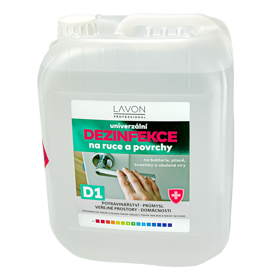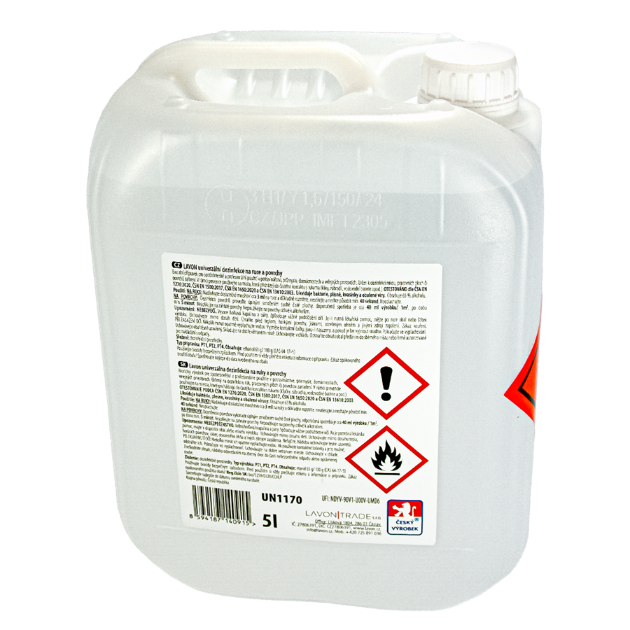LAVON univerzální dezinfekce na ruce a povrchy 5 l je biocidní přípravek pro spotřebitelské i profesionální použití v potravinářství, veřejných prostorách i domácnostech. Spolehlivě ničí bakterie, plísně, kvasinky a obalené viry. Obsahuje 65 % alkoholu.