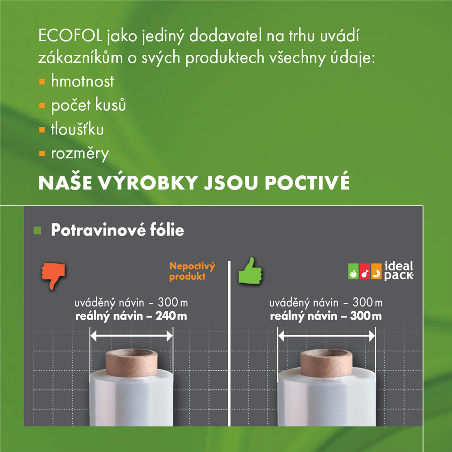 Nákupem nové fólie na potraviny ideal pack® UTF dosáhnete ideálního poměru ceny a kvality. Samozřejmostí je, že parametry výrobků značky ideal pack® odpovídají deklarovaným údajům.