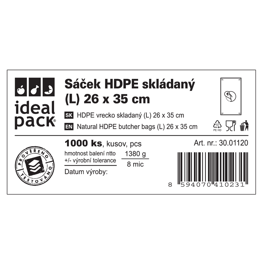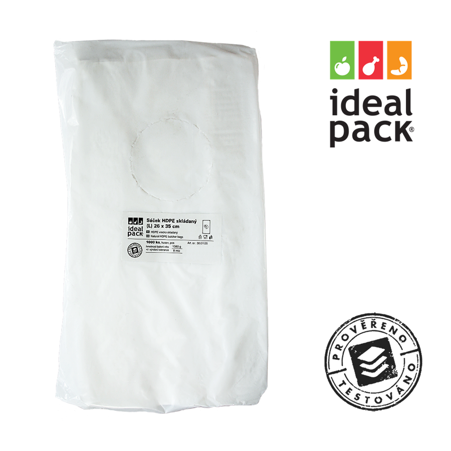 Mikrotenový sáček skládaný (L) 26x35 cm ideal pack®Do skládaných mikrotenových sáčků 26x35 cm balí nejčastěji své výrobky prodejci potravinářských výrobků, masa a uzenin, ovoce a zeleniny, pečiva. Skl...