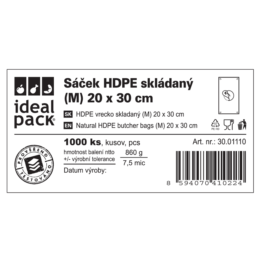 Mikrotenový sáček skládaný (M) 20x30 cm ideal pack®Do skládaných mikrotenových sáčků 20x30 cm balí nejčastěji své výrobky prodejci potravinářských výrobků, masa a uzenin, ovoce a zeleniny, pečiva. Skl...