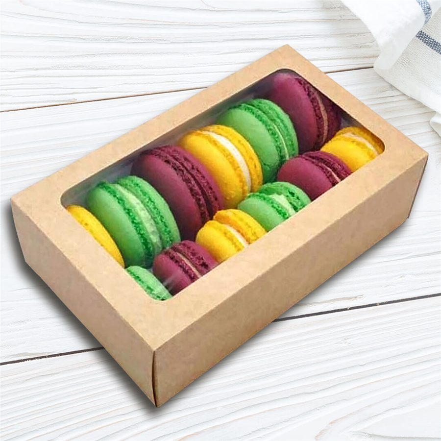 Papírové krabičky na makronky s okénkem 180x110x55 mm hnědé jsou oblíbeným ekologickým papírovým obalem, který se používá k odnosu a přepravě dortů, cukrovinek a zákusků, zejména oblíbených makronek.