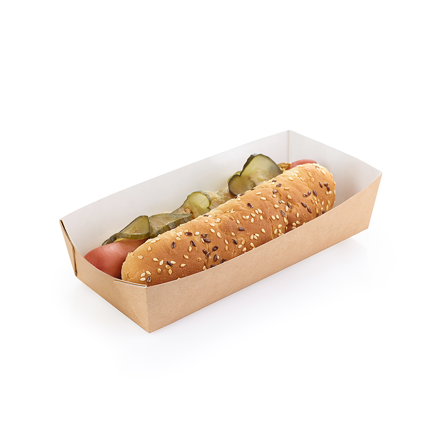Miska na párek v rohlíku či hod dog je vyrobena z kraftového papíru – z recyklovatelné lepenky.