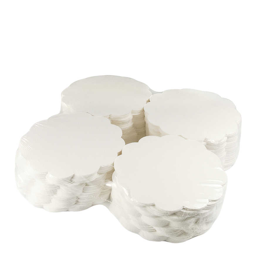 Bílé papírové rozetky 9 cm, se používají jako levné a zároveň vkusné podložky pod sklenice,