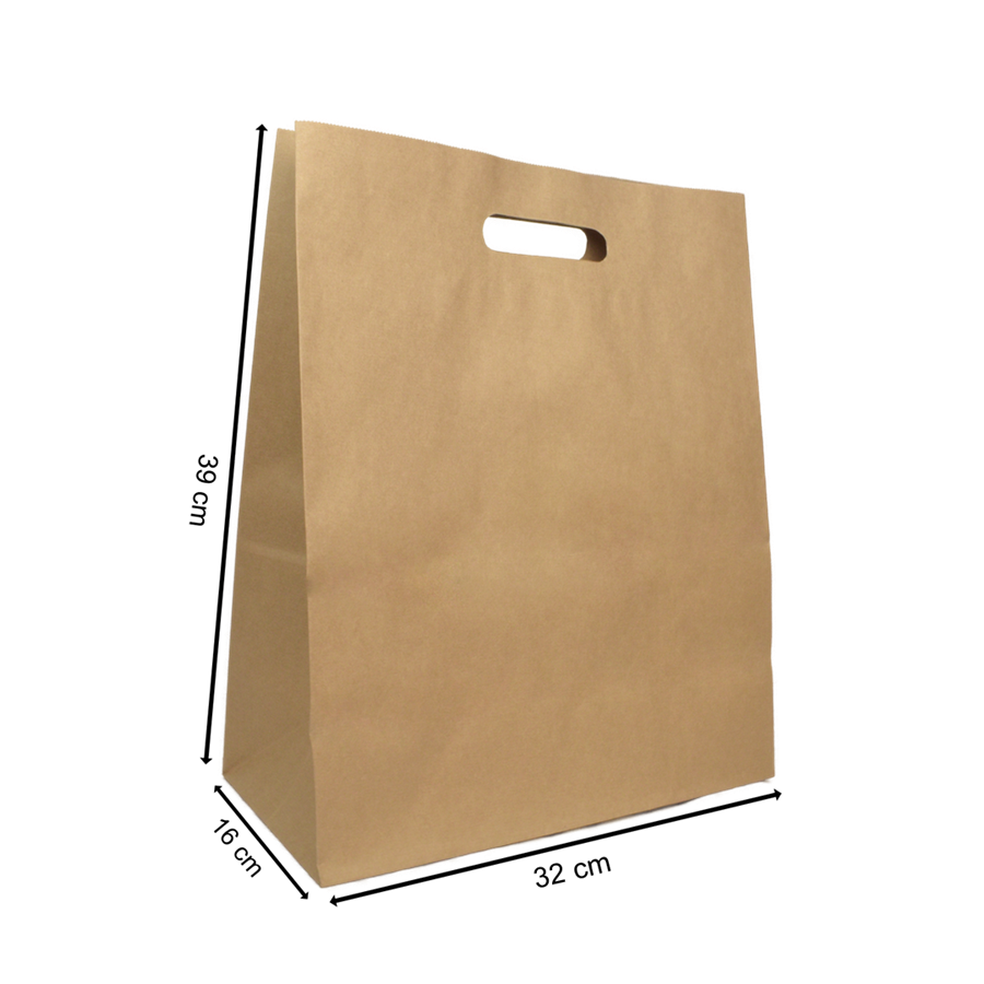 Papírové tašky s průhmatem 320+160x390 mm hnědá kraft jsou obvykle určené především pro odnos lehčích výrobků.