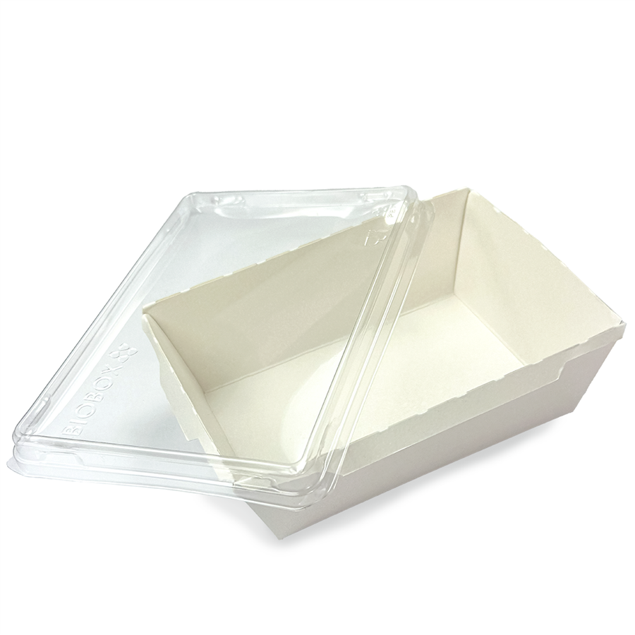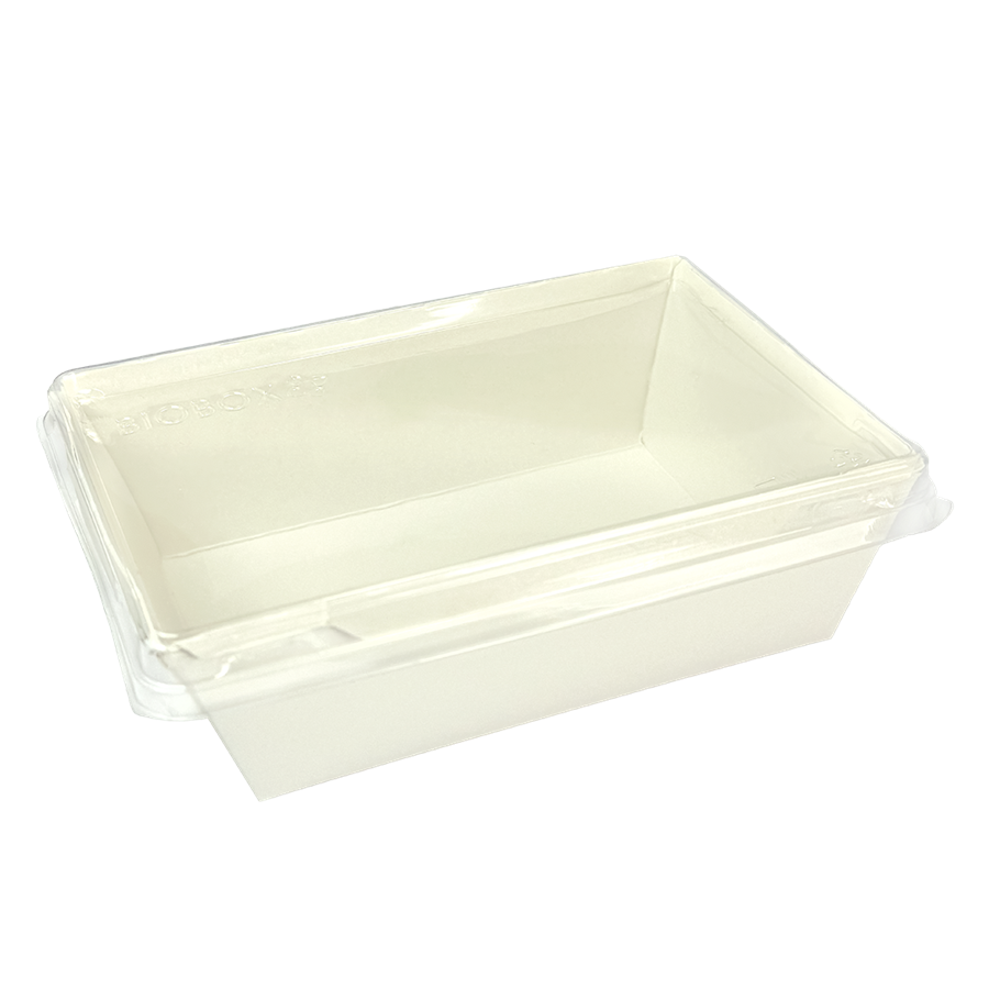 Tento papírový box na jídlo s víčkem je odolný proti vodě a mastnotě a je vhodný pro ohřev v mikrovlnné troubě (bez víčka).