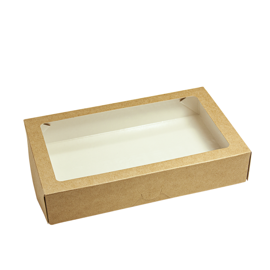 Papírový box (krabička) na jídlo, cukrovinky a sushiPapírový box na jídlo hnědý s okénkem 170x70x40 mm, je ekologický obal pro asijské restaurace a italské restaurace, take away restaurace a prodejce ...