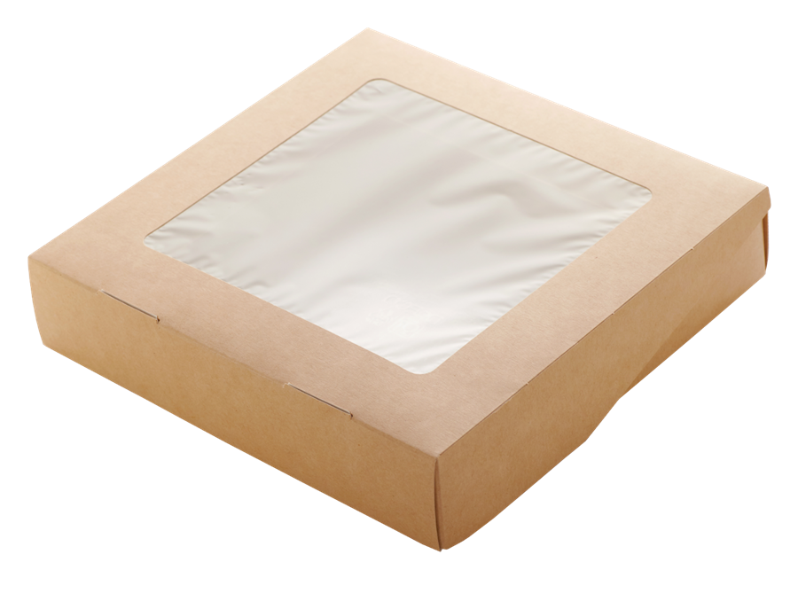 Papírový box / papírová krabička 260x260x40 mm EKO na jídlo a potraviny s okénkem je ekologické řešení pro italské, asijské a take away restaurace. Papírový box/papírová krabička je vhodný obal pro balení a rozvoz hotových jídel. Tento papírový box na potraviny je odolný proti vodě a mastnotě.