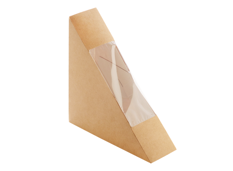 Papírový box EKO na sendvič 130x130x40 mm hnědý s okénkem je ekologické řešení pro kavárny, bary, fast food a take away restaurace.