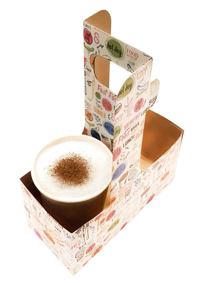 Papírový nosič EKO na 2 kelímky CTG s potiskem je ekologické řešení pro pekárny, kavárny, fast food a take away restaurace. Nosič je vhodný k přepravě dvou kelímků na čaj nebo kávu.