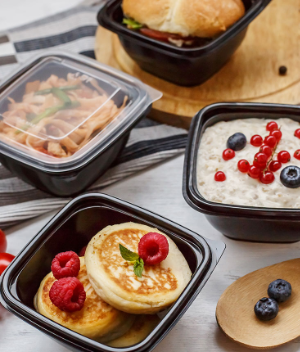 jednorázová plastová miska, plastová černá miska, černá plastová miska s víčkem, miska na rozvoz, krabička na jídlo, krabička na jídlo s víčkem, plastová krabička na salát, plastová krabička na dezerty