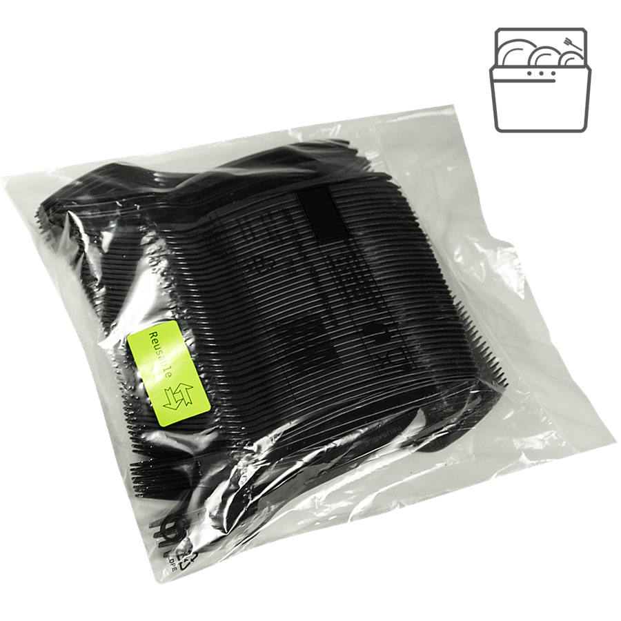 Opakovaně použitelná plastová vidlička 18 cm černáPlastové vidličky jsou určeny jak k jednorázovému, tak opakovanému použití.Tyto opakovaně použitelné plastové vidličky lze umývat v myčkách na nádobí,...