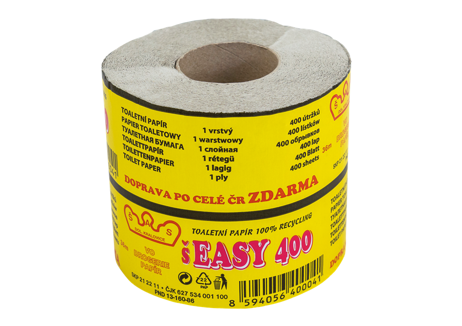 Toaletní papíry EASY 400 jsou vyrobené ze 100 % recyklovaného papíru a jsou