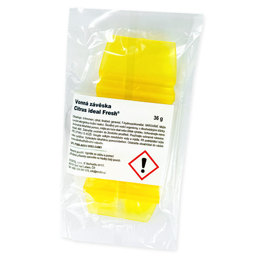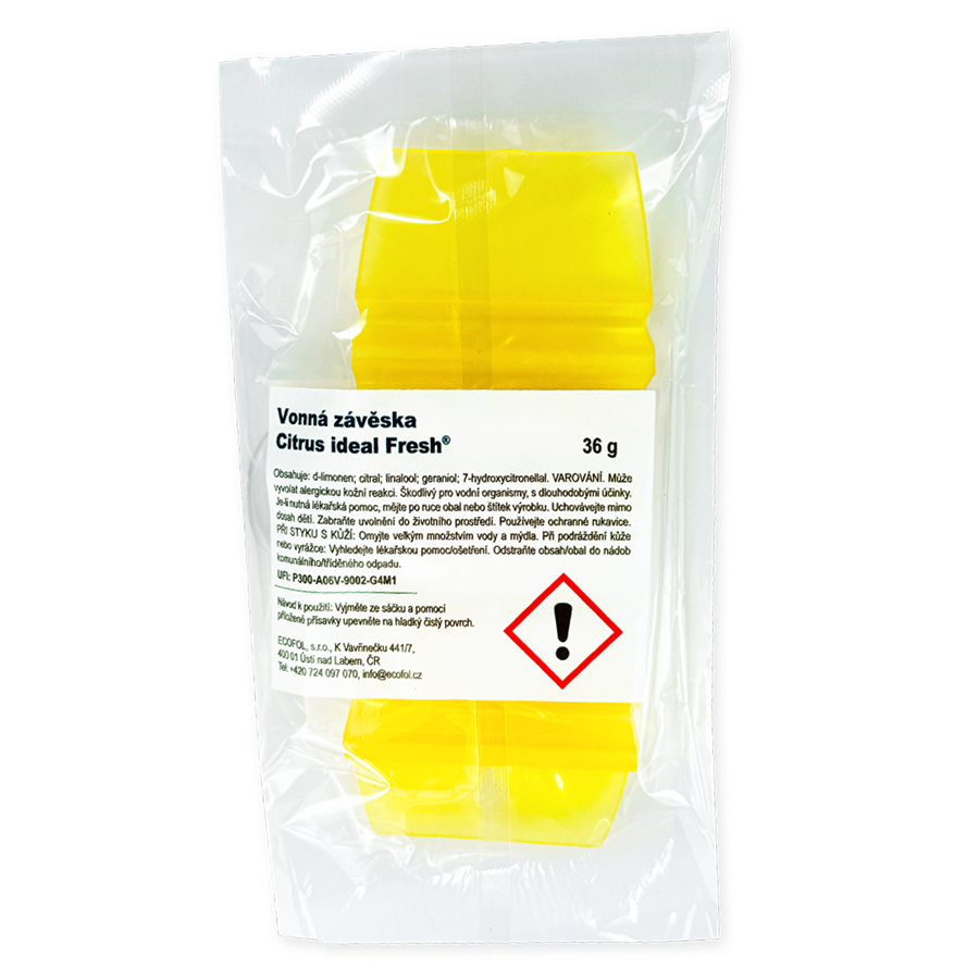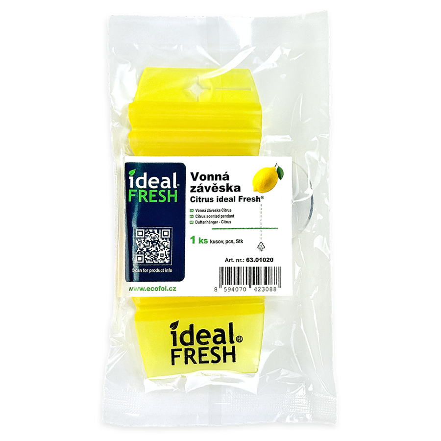 Hang tag vonná závěska Citrus ideal Fresh je praktický a efektivní osvěžovač vzduchu, který přináší dlouhotrvající vůni citrusu. Díky inovativní technologii postupného uvolňování parfemace dokáže tato závěska provonět různé prostory až na 30 dní. Je ideální pro domácnosti, toalety, šatny, kanceláře, vstupní haly, automobily, restaurace a další interiéry, kde je třeba eliminovat nepříjemné pachy. Díky univerzálnímu tvaru ji lze snadno zavěsit na háček, trubku nebo umístit na rovný povrch.