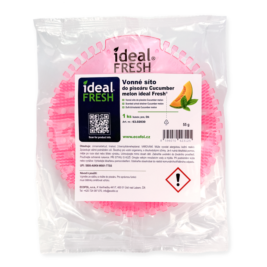Vonné sítko do pisoáru Cucumber melon ideal Fresh je praktickým řešením pro udržení čistoty a svěžesti na veřejných i soukromých toaletách. Sítko do pisoáru pomáhá neutralizovat nepříjemné pachy, zabraňuje ucpávání odtoku a zároveň zajišťuje dlouhotrvající příjemnou vůni. Díky moderní konstrukci je toto sítko do pisoáru vhodné pro široké spektrum míst. Využití najde v restauracích, kancelářských budovách, obchodních centrech, hotelech, čerpacích stanicích i sportovních zařízeních. Varianta Cucumber melon nabízí svěží vůni okurky a melounu, která účinně překrývá zápach a zanechává hygienicky příjemné prostředí.